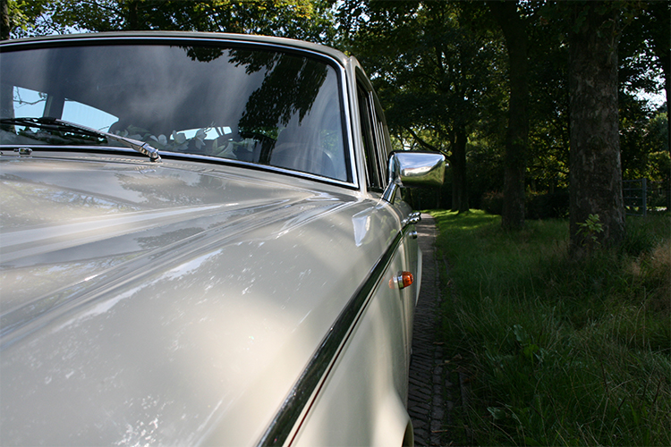 Deze stijlvolle bruidswagen is in een warme room-witte tint gespoten, is ruim 5 meter lang, en heeft een eigen gewicht van 2103 kg (!). Daarom is het maar goed dat de tankinhoud niet minder dan liefst 109 liter bedraagt. Als u zich in deze bruidswagen laat vervoeren zult u merken dat menigeen om kijkt om deze wagen nog even na te staren. Het is nel een sprookje, u voelt zich even als een vorst!